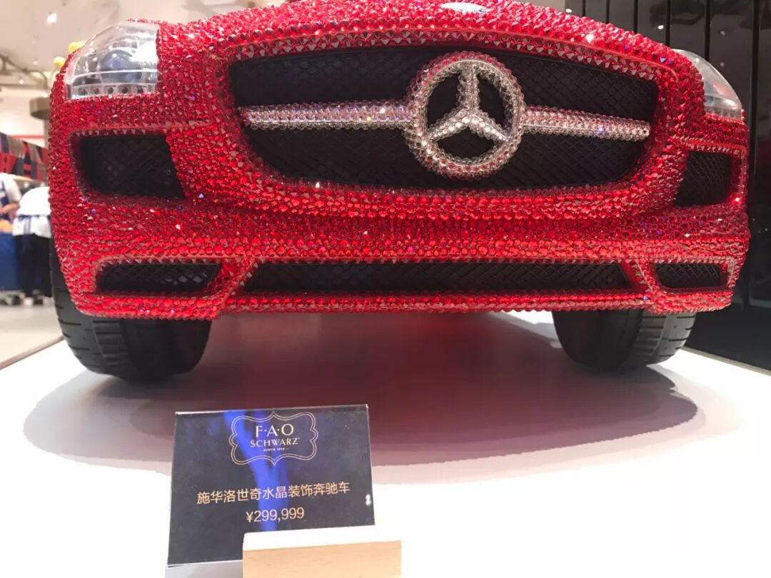 再往前走,这辆红色的奔驰小汽车,贵气逼人,让叨叨忍不住凑上前去,同样全身包裹着施华洛世奇水晶,价格叨叨怕数不清几位数,就不写了(给大家拍下来了)总之可以买一辆真正的汽车了!